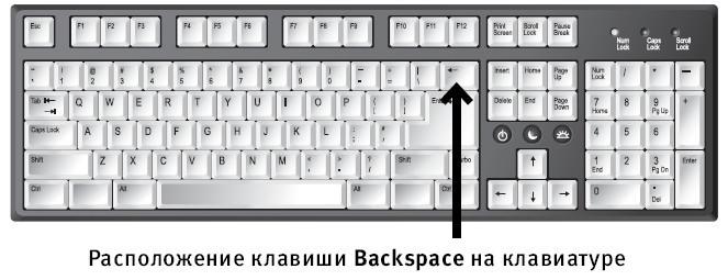 Клавиша Backspace (бэкспэйс) находится вверху, в ряду, в котором расположены цифры. Ищите ее справа, сразу за клавишей «=+». Иногда на ней нет названия, а просто нарисована стрелочка влево.