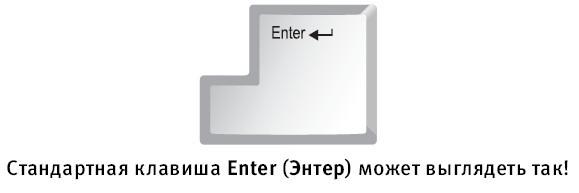 Клавиша Enter (энтер) расположена с правой стороны от кнопок с буквами. На некоторых клавиатурах на клавише не обозначено название, а нарисована только стрелка, согнутая под прямым углом. Это одна из основных кнопок, используемых при любой работе на компьютере.