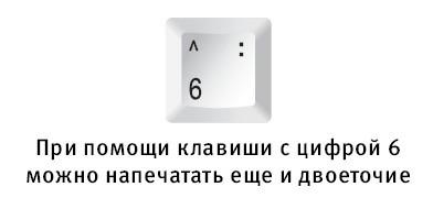 Например, при помощи одной клавиши «6:» можно напечатать и цифру 6, и двоеточие. Для того чтобы напечатать двоеточие, а не цифру, необходимо одновременно с клавишей «6:» нажать клавишу Shift.