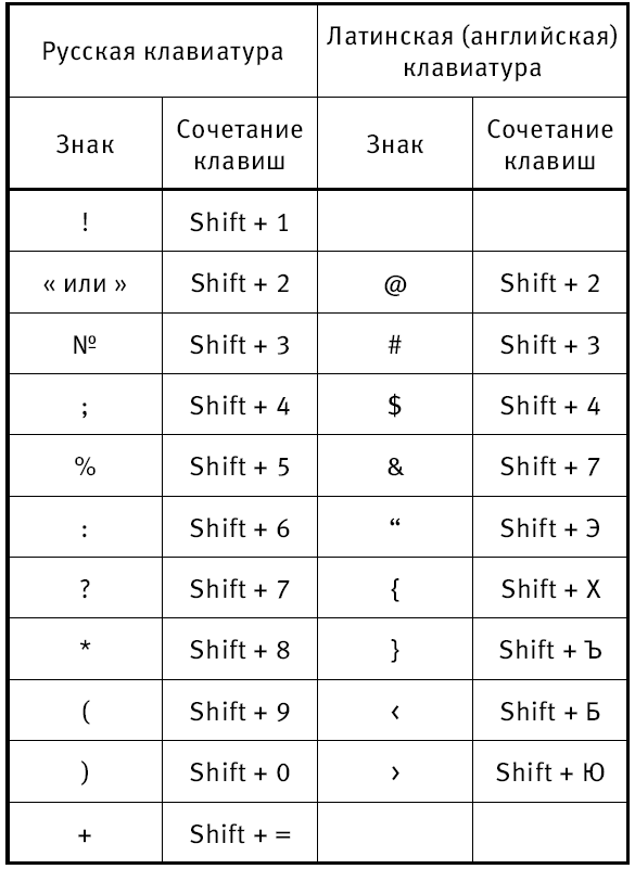 Ниже представлена таблица, которая поможет вам найти нужные комбинации клавиш для печати различных значков.