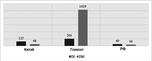 Рис. 1.4. Уровень финансовой глубины Китая, Гонконга и России, 2011–2015 гг., медианные значения показателей: DI — кредиты частному сектору (к ВВП), %; DM — капитализация рынка акций (к ВВП), %