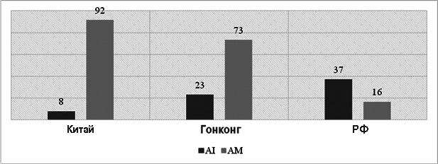 Рис. 1.5. Доступность финансовых ресурсов в Китае, Гонконге и России, 2011–2015 гг., медианные значения показателей: AI — количество банковских отделений (на 1000 взрослых лиц); AM — относительный объем торгов компаний, не входящих в 10 наиболее активно торгуемых, %