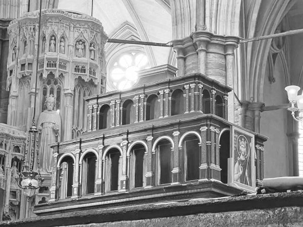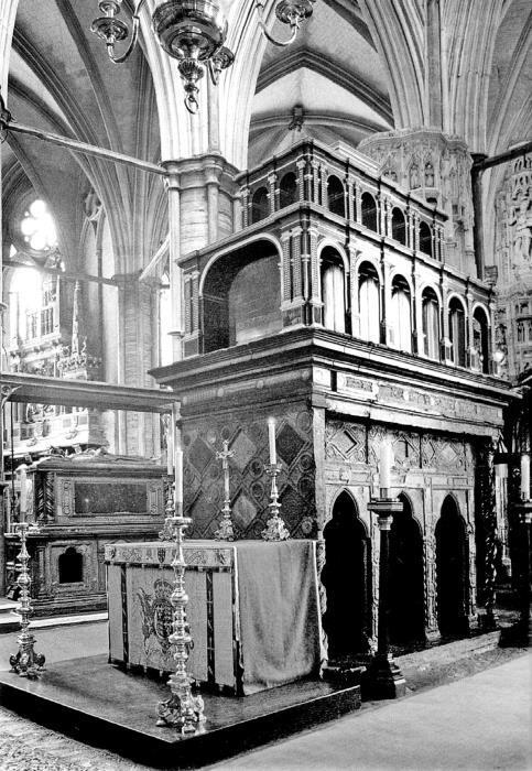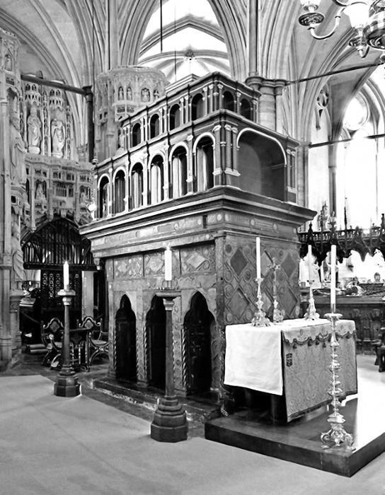 Часовня отделена от алтаря резными вратами XV столетия. Перед ними находятся щит короля Эдуарда I и ЗНАМЕНИТЫЙ ТРОН ДЛЯ КОРОНАЦИЙ АНГЛИЙСКИХ КОРОЛЕЙ СО ВДЕЛАННЫМ В НЕГО КУСКОМ ПРОСТОГО КАМНЯ. ЭТО – «КАМЕНЬ СУДЬБЫ», ОДНА ИЗ ИСТОРИЧЕСКИХ РЕЛИКВИЙ АНГЛИИ. Король Эдуард I, покоритель Шотландии, привез оттуда в 1296 году этот Камень, считавшийся символом независимости Шотландии, и вделал его в трон английских королей. Начиная с Эдуарда I на этом троне перед алтарем Вестминстерского собора короновались все короли Англии. В эпоху ранее XX века только однажды трон покидал стены Вестминстерского аббатства: в декабре 1653 года его переносили во дворец Вестминстер Холл ДЛЯ ЦЕРЕМОНИИ ПРОВОЗГЛАШЕНИЯ КРОМВЕЛЯ ЛОРДОМ-ПРОТЕКТОРОМ. См. https://www.booksite.ru/fulltext/0/001/005/203/59.htm.