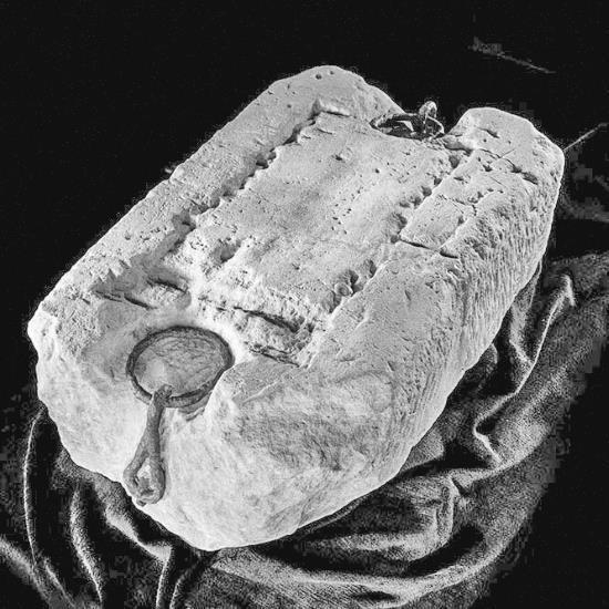 Рис. 38-2. В небольшом углублении на грани Камня Судьбы, на дне выщербины, видны четыре мелкие римские цифры XXXV и еще какой-то туманный росчерк справа. Но, скорее всего, эти маленькие циферки были процарапаны не так давно и вряд ли были на Камне изначально. Может быть, это поздний инвентарный номер хранения. Взято из Интернета