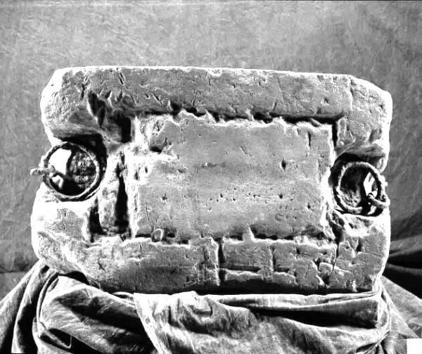 Рис. 38-3. На одной из боковых граней Камня Судьбы видно несколько аккуратных отверстий и вверху вроде бы следы орнамента. Может быть, здесь была какая-то табличка, прикрепленная болтами к Камню. Табличка исчезла, а отверстия для болтов остались. Взято из Интернета