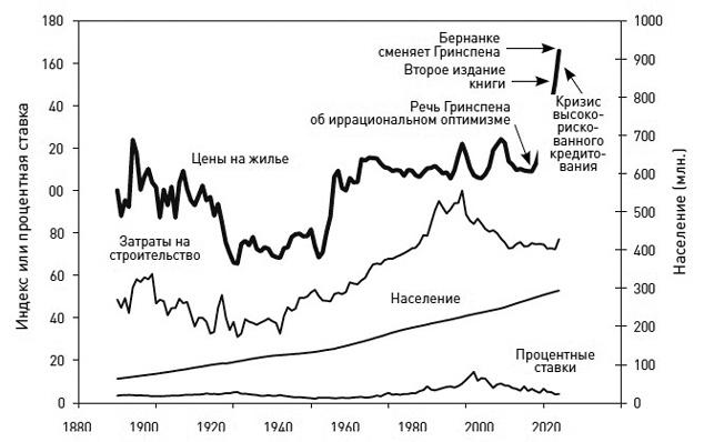 Примечание. Жирная сплошная линия (левая шкала) — реальный (скорректированный на инфляцию) индекс цен на жилье в США (1890 г. = 100), построенный автором на основе нескольких существующих индексов и исходных данных по ценам на жилье; тонкая линия (левая шкала) — реальный индекс затрат на строительство (1979 г. = 100), построенный автором на основе двух официальных индексов; тонкая линия (правая шкала) — население США в млн человек (данные Бюро переписи населения США); самая нижняя тонкая линия (левая шкала) — долгосрочная процентная ставка, график которой построен автором на основе данных из двух источников.