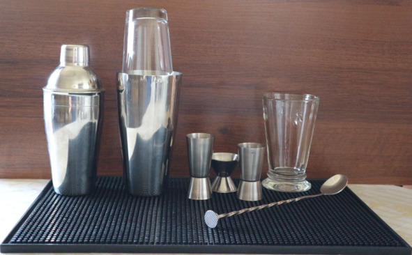 Обязательный инвентарь бармена. Слева направо: обычный шейкер, бостонский шейкер, три джиггера разного объема, смесительный стакан и барная ложка
