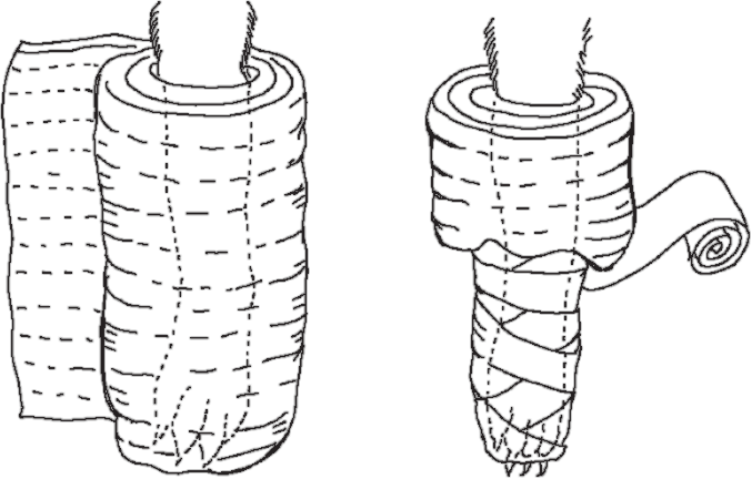 Бинтовые повязки бывают циркулярными, спиральными, ползучими, восьмиобразными. При циркулярной повязке туры бинта закрывают друг друга, тогда как при спиральной покрывают предыдущий на 1/2–1/3, а при ползучей – не находят друг на друга. При наложении восьмиобразной повязки бинт закрепляют циркулярными турами ниже сустава, затем переводят через бинтуемый сустав вверх, где также закрепляют циркулярно. Так повторяют, пока сустав не будет полностью закрыт.
