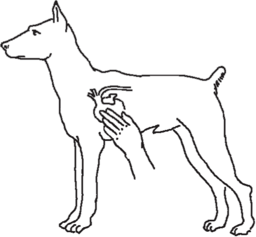 Перкуссия (выстукивание) сердечной области. Зона сердечной тупости у собак расположена в третьем – шестом межреберье. Абсолютная сердечная тупость сердца находится в четвертом – шестом межреберье. Передняя граница ее проходит от середины грудной кости параллельно каудальному краю четвертого ребра, далее отвесно до реберных соединений, а дорсальная граница горизонтально достигает шестого межреберья, образуя изогнутую назад кривую. Каудально она переходит в зону печеночной тупости, а со средней линии груди – в правостороннее сердечное притупление в четвертом – пятом межреберье на 1–2 см выше края грудной кости.