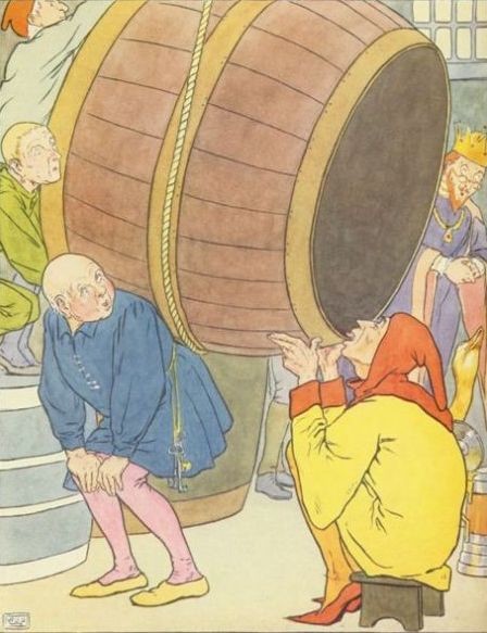 He led him to the King's cellar, and the man at once sat down in front of the great cask, and drank and drank till before a day was over he had drunk the whole cellarful of wine. Then the Simpleton demanded his bride again, but the King was angry that a mean fellow everyone called a Simpleton should win his daughter, and he made new conditions. Before giving him his daughter to wife he said that the Simpleton must find a man who would eat a whole mountain of bread. The Simpleton did not stop long to consider, but went off straight to the wood. There in the same place as before sat a man who was buckling a strap tightly around him, and looking very depressed. He said: