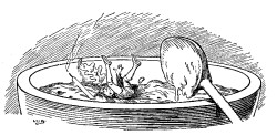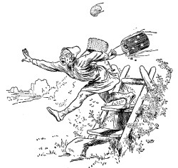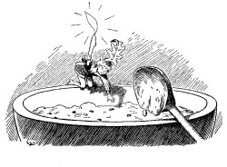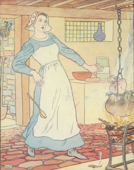 As Tom grew older, he became very amusing and full of tricks, so that his mother was afraid to let him out of her sight. One day, while she was making a batter pudding, Tom stood on the edge of the bowl, with a lighted candle in his hand, so that she might see that the pudding was made properly. Unfortunately, however, when her back was turned, Tom fell into the bowl, and his mother, not missing him, stirred him up in the pudding, tied it in a cloth, and put it into the pot. The batter filled Tom's mouth, and prevented him from calling out, but he had no sooner felt the hot water, than he kicked and struggled so much that the pudding jumped about in the pot, and his mother, thinking the pudding was bewitched, was nearly frightened out of her wits. Pulling it out of the pot, she ran with it to her door, and gave it to a tinker who was passing. He was very thankful for it, and looked forward to having a better dinner than he had enjoyed for many a long day. But his pleasure did not last long, for, as he was getting over a stile, he happened to sneeze very hard, and Tom, who had been quite quiet inside the pudding for some time, called out at the top of his little voice, "Hallo, Pickens!" This so terrified the tinker that he flung away the pudding, and ran off as fast as he could. The pudding was all broken to pieces by the fall, and Tom crept out, covered with batter, and ran home to his mother, who had been looking everywhere for him, and was delighted to see him again. She gave him a bath in a cup, which soon washed off all the pudding, and he was none the worse for his adventure.