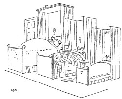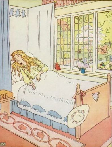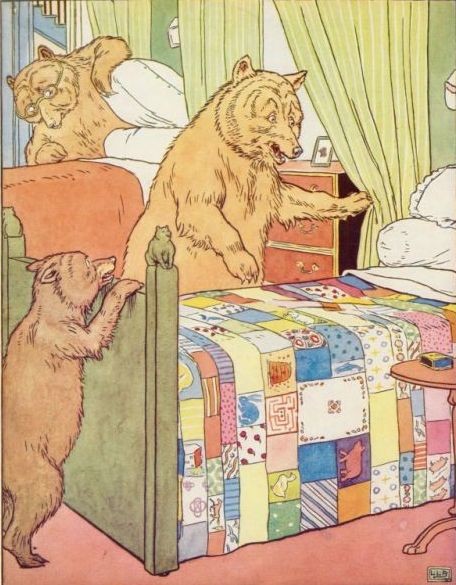 Then Goldenlocks went upstairs into the bedchamber in which the three Bears slept. And first she lay down upon the bed of the Great, Huge Bear, but that was too high at the head for her. And next she lay down upon the bed of the Middle Bear, and that was too high at the foot for her. And then she lay down upon the bed of the Little, Small, Wee Bear; and that was neither too high at the head nor at the foot, but just right. So she covered herself up comfortably, and lay there till she fell fast asleep.