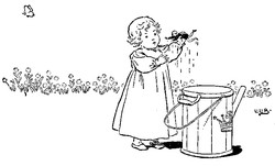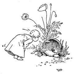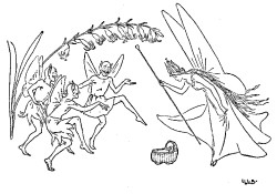 Shortly after his return, he one day displeased the King, so, fearing the royal anger, he crept into an empty flower-pot, where he lay for a long time. At last he ventured to peep out, and, seeing a fine large butterfly on the ground close by, he stole out of his hiding-place, jumped on its back, and was carried up into the air. The King and nobles all strove to catch him, but at last poor Tom fell from his seat into a watering-pot, in which he was almost drowned, only luckily the gardener's child saw him, and pulled him out. The King was so pleased to have him safe once more that he forgot to scold him, and made much of him instead.