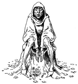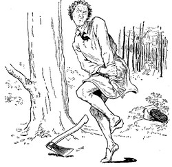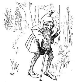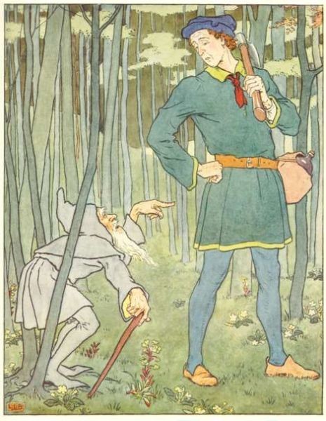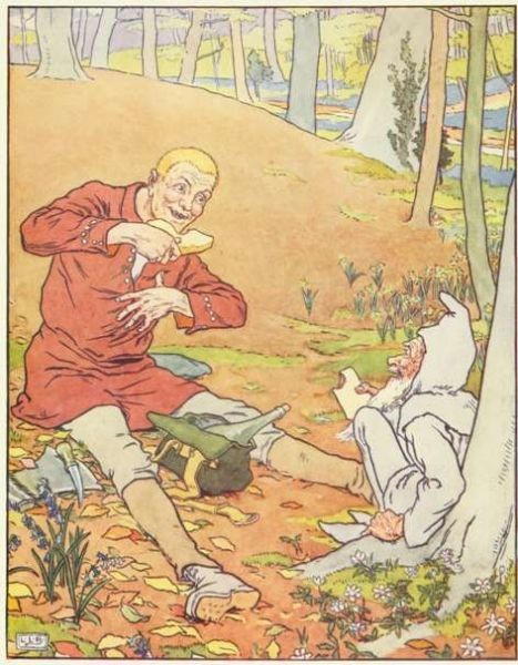 Thereupon the second son went into the wood, and the Mother gave him, as she had given to the eldest, a sweet cake and a bottle of wine. The little old man met him also, and begged for a small slice of cake and a drink of wine. But the second son spoke out quite plainly. "What I give to you I lose myself—be off with you," and he left the little man standing there, and walked on. Punishment was not long in coming to him, for he had given but two strokes at a tree when he cut his leg so badly that he had to be carried home.