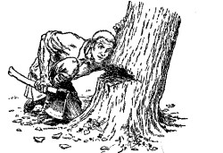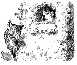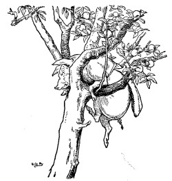 Well, the little Pig woke at four the next morning, and bustled up, and went off for the apples, hoping to get back before the Wolf came; but he had farther to go, and had to climb the tree, so that just as he was coming down from it, he saw the Wolf coming, which, as you may suppose, frightened him very much. When the Wolf came up he said, "Little Pig, what! are you here before me? Are they nice apples?"