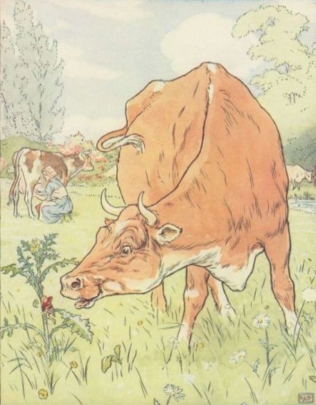 A few days after this, Tom accompanied his mother when she went into the fields to milk the cows, and, fearing he might be blown away by the wind, she tied him to a sow-thistle with a little piece of thread. While she was milking, a cow came by, bit off the thistle, and swallowed up Tom. Poor Tom did not like her big teeth, and called out loudly, "Mother, mother!" "But where are you, Tommy, my dear Tommy?" cried out his mother, wringing her hands. "Here, mother," he shouted, "inside the red cow's mouth!" And, saying that, he began to kick and scratch till the poor cow was nearly mad, and at length tumbled him out of her mouth. On seeing this, his mother rushed to him, caught him in her arms, and carried him safely home.