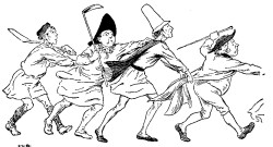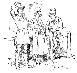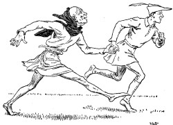 The next morning the Simpleton took the goose under his arm and went on his way, without troubling himself at all about the three girls who were hanging to the bird. There they went, always running behind him, now to the right, now to the left, whichever way he chose to go. In the middle of the fields they met the parson, and when he saw the procession he called out, "Shame on you, you naughty girls, why do you run after a young fellow in this way? Come, leave go!" With this he caught the youngest by the hand, and tried to pull her back, but when he touched her he found he could not get away, and he too must needs run behind. Then the sexton came along, and saw the parson following on the heels of the three girls. This so astonished him that he called out, "Hi! Sir Parson, whither away so fast? Do you forget that today we have a christening?" and ran after him, and caught him by the coat, but he too remained sticking fast.