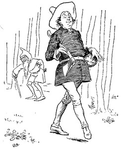 The parents were now very happy, and the christening of the little fellow took place with great ceremony. The Fairy Queen, attended by all her company of elves, was present at the feast. She kissed the little child, and, giving it the name of Tom Thumb, told her fairies to fetch the tailors of her Court, who dressed her little godson according to her orders. His hat was made of a beautiful oak leaf, his shirt of a fine spider's web, and his hose and doublet were of thistledown, his stockings were made with the rind of a delicate green apple, and the garters were two of the finest little hairs imaginable, plucked from his mother's eyebrows, while his shoes were made of the skin of a little mouse. When he was thus dressed, the Fairy Queen kissed him once more, and, wishing him all good luck, flew off with the fairies to her Court.