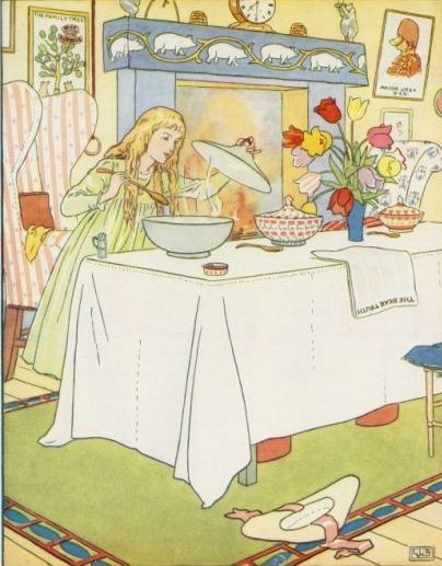 So first she tasted the porridge of the Great, Huge Bear, and that was too hot for her. And then she tasted the porridge of the Middle Bear, and that was too cold for her. And then she went to the porridge of the Little, Small, Wee Bear, and tasted that; and that was neither too hot nor too cold, but just right, and she liked it so well that she ate it all up.