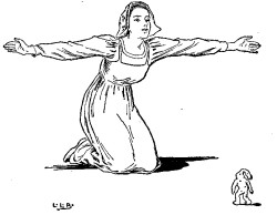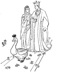 Now the innkeeper had three daughters, who on seeing the goose were curious to know what wonderful kind of a bird it could be, and longed to have one of its golden feathers. The eldest daughter thought to herself, "Surely a chance will come for me to pull out one of those feathers"; and so when the Simpleton had gone out, she caught the goose by the wing. But there her hand stuck fast! Shortly afterwards the second daughter came, as she too was longing for a golden feather. She had hardly touched her sister, however, when she also stuck fast. And lastly came the third daughter with the same object. At this the others cried out, "Keep off, for goodness' sake, keep off!" But she, not understanding why they told her to keep away, thought to herself, "If they go to the goose, why should not I?" She sprang forward, but as she touched her sister she too stuck fast, and pull as she might she could not get away; and thus they had all to pass the night beside the goose.