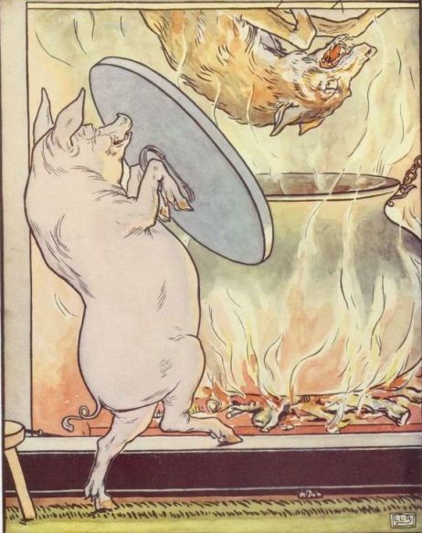 When the little Pig saw what he was about, he hung on the pot full of water, and made up a blazing fire, and, just as the Wolf was coming down, took off the cover of the pot, and in fell the Wolf. And the little Pig put on the cover again in an instant, boiled him up, and ate him for supper, and lived happy ever after.