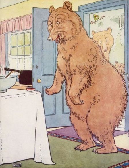 By this time the Three Bears thought their porridge would be cool enough; so they came home to breakfast. Now Goldenlocks had left the spoon of the Great, Huge Bear standing in his porridge.