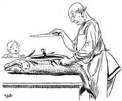 Some days after this, his father took him to the fields a-ploughing, and gave him a whip, made of a barley straw, with which to drive the oxen; but little Tom was soon lost in a furrow. An eagle seeing him, picked him up and flew with him to the top of a hill where stood a giant's castle. The giant put him at once into his mouth, intending to swallow him up, but Tom made such a great disturbance when he got inside that the monster was soon glad to get rid of him, and threw him far away into the sea. But he was not drowned, for he had scarcely touched the water before he was swallowed by a large fish, which was shortly afterwards captured and brought to King Arthur, as a present, by the fisherman. When the fish was opened, everyone was astonished at finding Tom inside. He was at once carried to the King, who made him his Court dwarf.