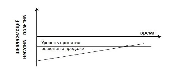 Когда клиент приходит в дилерский центр, он уже более-менее заинтересован в покупке определенной модели или конкретного автомобиля, который он выбрал. То есть в начале общения с продавцом клиент уже испытывает к машине положительные эмоции, но обычно эти эмоции ниже, чем уровень принятия решения о покупке. В процессе общения продавец клиенту что-то рассказывает, показывает автомобиль. Клиенту автомобиль нравится все больше и больше, и в какой-то момент положительные эмоции превышают необходимый для покупки уровень. Тогда ценность автомобиля для клиента становится выше, чем его цена, и он принимает решение купить автомобиль.
