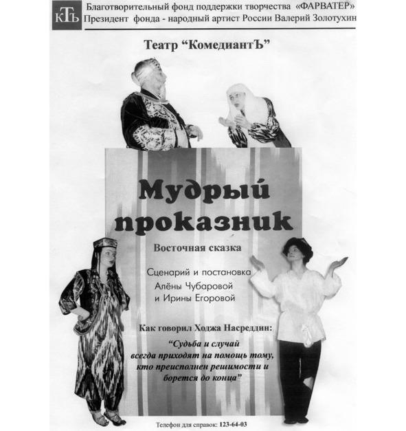 Поставленную пьесу назвали «Мудрый проказник». Господин Зафар название одобрил. Фразу на афише «совместный проект с посольством Узбекистана в РФ» тоже.
