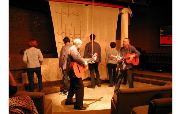 Поначалу я воодушевил себя иллюзорной (и, наверное, знакомой каждому дилетанту на этом поприще) теорией, что наверняка смогу сыграть роли какого-то определённого, подходящего мне по темпераменту плана. Алёна тоже, видимо, думала в этом направлении, потому что предложила мне роль «парня с гитарой», которого, вдобавок ко всему, еще и обозвали Лёхой. Но я быстро понял, что дело не в амплуа, не в аутентичной роли, а, напротив, в способности абстрагироваться от себя. Потому что, если думать о соответствии роли, если взыскательно примерять её на себя, то неизбежно вскроются какие-то несовпадения, нестыковки. И в таком случае «аллергия» неминуема, будет тесно и неуютно. Короче говоря, я понял, что играть себя в театральном коллективе в рамках некоей постановки невозможно, даже если этого хочет режиссёр. Память моя с некоторых пор сильно ослабла, поэтому, что и когда было, я восстановить толком не могу. Помню, как я впервые был на спектакле «Комедианта» в музее Маяковского и поразился их профессионализму (грешным делом, я ожидал увидеть что-то откровенно любительское). Помню моё первое посещение театра «Русский дом», где долгое время выступала труппа. Там я впервые поучаствовал в театральном действе — в качестве светотехника. Потом начались и репетиции с моим участием. Одна из первых репетиций проходила в литинституте, т.е. я, наверное, тогда ещё был проректором или только что перестал им быть. Я должен был по ходу спектакля (это было нечто вроде капустника) исполнить три своих песни (которые, на мой взгляд, слабо коррелировали с действием) и произнести несколько реплик. Самым трудным оказалось участие в заключительной сцене — сцене незамысловатого группового танца. Дело в том, что хореография была для меня ещё более чуждой и враждебной стихией, чем театр. Но я убедил себя, что раз уж даже плавать научился (незадолго до того), то и танцевать как-нибудь тоже смогу. Конечно, нужно поблагодарить коллег за доверие и терпение, проявленное ко мне. Кроме того, меня утешала общая бесшабашность постановки. А ещё подбадривало то, что я был не единственным любителем в труппе. В 2000 году театр ещё был полупрофессиональным. Интересно, что поначалу самым сильным актёром мне показался такой же любитель, как и я, — врач, чей приёмный кабинет располагался в том же здании, где проходили наши репетиции. Владислав играл продюсера певицы, которая, по сценарию, уходит от него к простым людям — обитателям коммуналки, где по прихоти этого продюсера снимают её клип. Его хар