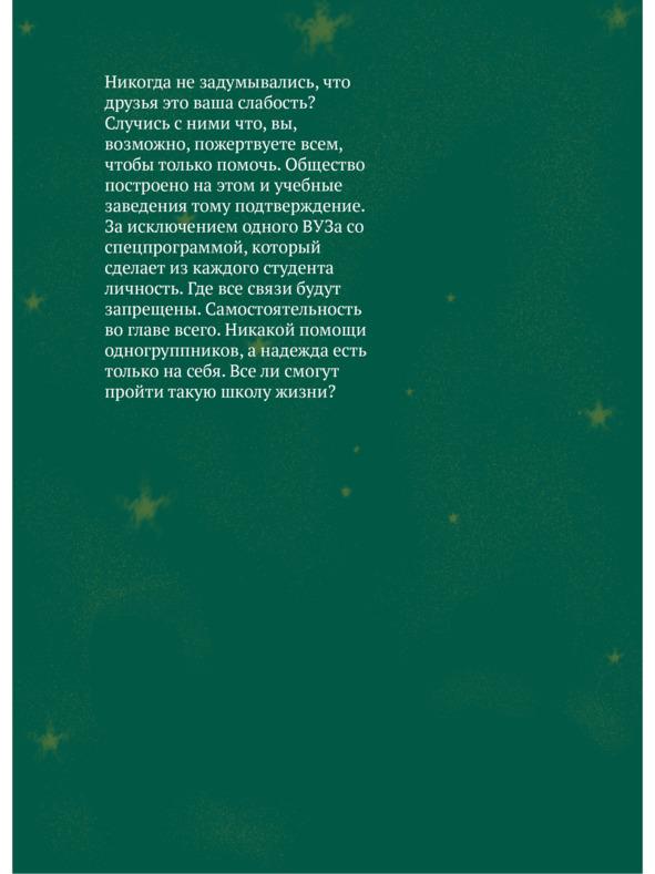Линейка. Первое сентября. Странности начались. Никаких тебе КВНов, футболов или студенческих организаций. Записаться можно было, к примеру, на шахматы, лёгкую атлетику, веб-разработку — и всё под соусом «никакой командной работы». Только соперничество и личные достижения». «В тот момент, я, конечно, напрягся, но на фоне остальных первокуров, с которыми в тот день, кстати, ещё не запрещали общаться, знакомиться и ходить компашкой, всё выглядело не так крипово». Уйдя в соседние дворы, Крис достал телефон и написал другу. Уже прошло пару лет, как они были одногруппниками, но слово «друг» находилось под запретом в данном заведении, как и, в принципе, любое виртуальное общение. Встретиться можно было в любой точке планеты, кроме этого, общажного и универского клочка земли. «Подумать только. Раньше я свободно гулял и общался с друзьями. Делился с ними всем наболевшим, а теперь на тебе. Как же было круто ночевать компашкой у кого-то! Проводить всю ночь, играя в компьютерные игры. Сейчас в общаге мы бы вообще были счастливы. Зачем я вообще всё это терплю? Пару часов с другом подальше от этого ненавистного места, а после возвращение по одному, а то вдруг что заподозрят». Ответить самому себе ему не дал Алекс, универский друг, с которым он и хотел встретиться.