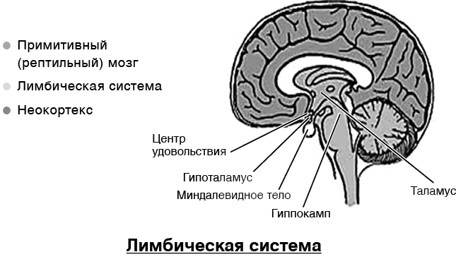 Одним из крупнейших прорывов в изучении саморегуляции стало открытие лимбической системы, которую Джозеф Леду назвал «эмоциональным мозгом». Это комплекс структур, расположенный ниже префронтальной коры (ПФК); его основные структуры — миндалевидное тело, гиппокамп, гипоталамус и стриатум. Лимбическая система, и в частности миндалевидное тело и центр удовольствия (в вентральном стриатуме), отвечает за наши эмоции и порывы. Она играет ключевую роль в формировании воспоминаний и эмоциональных ассоциаций, связанных с этими воспоминаниями, — как положительных, так и отрицательных. Любовь, желание, страх, стыд, гнев и травмы делят здесь общий «неврологический кров».