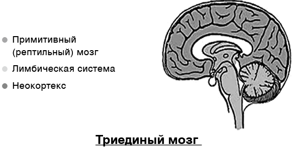 В 1960-е годы Пол Маклин, нейробиолог из Йельского университета, разработал теоретическую модель мозга, представляющую интерес и по сей день. Согласно этой триединой модели, в действительности у нас не один, а три разных мозга, которые формировались в разные периоды человеческой эволюции и, соответственно, накладывались друг на друга слоями. Верхний слой — это мозг человека, или неокортекс. Он отвечает за функции более высокого порядка: язык, мышление, «чтение» эмоциональных сигналов и самоконтроль. Под ним находится гораздо более древний мозг млекопитающего, или лимбическая система, отвечающая за эмоциональную сферу. И наконец, в нижней части расположен наиболее древний и примитивный рептильный мозг, тесно взаимодействующий с лимбической системой в регуляции наших реакций в экстренных ситуациях.