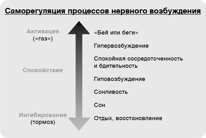 Регуляция возбуждения — вспомогательная функция активации вегетативной нервной системы (ВНС), что делает нас более возбужденными, и ингибирования парасимпатической нервной системы (ПНС), что замедляет наше восприятие. Проще говоря, это что-то вроде педалей газа и тормоза, на которые жмет мозг. Что именно необходимо в конкретной ситуации — активация или восстановление, — зависит от задачи и, конечно же, от наших ресурсов. В течение дня мы курсируем по шкале возбуждения, как по американским горкам. Когда возбуждение растет, потребление энергии, естественно, тоже растет; когда возбуждение спадает, мы восстанавливаем свои ресурсы.