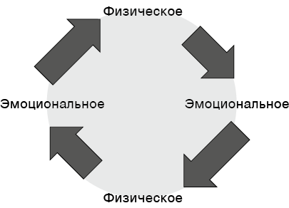 На самом деле в цикле стресса больше элементов, но об этом чуть позже. Начнем с простой версии, показывающей взаимосвязь между физическим и эмоциональным состоянием (см. рисунок выше).
