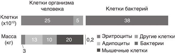 Из всего этого гигантского объема биомассы микробов, только часть способна колонизировать и жить внутри и на поверхности человеческого тела. По сути, человеческий организм и микробы, проживающие в нем, формируют единое целое – то, что еще в середине ХХ века было названо суперорганизм. Количество микробов, проживающих в организме человека, в 10–100 раз превышает количество собственных клеток самого человека. Это 1015 (квадриллион, т. е. миллион миллиардов) бактерий в сравнении с «всего» 1013–1014 (10–100 триллионов) человеческих клеток. Суммарная биологическая масса этих бактерий внутри и на поверхностях тела человека колеблется в районе 1–1,5 кг.