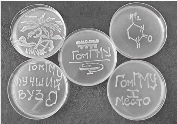 Более того, ряд профессиональных сообществ учредили конкурсы среди ученых, как молодых, так и состоявшихся, в области этого оригинального направления, на стыке науки и искусства. Это конкурсы Американского общества микробиологов, конкурс «Красота микромира» (Россия) и другие. Лучшие работы российских микробиологов вы сможете увидеть, набрав в интернете название конкурса «Красота микромира», а мы представим то, что изобразили микробами на чашке Петри совсем не профессионалы, а всего лишь студенты второго курса Гомельского медицинского университета на занятиях по микробиологии (Рис. 7).