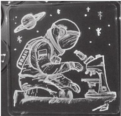 Один же из победителей конкурса агар-арта от Американского общества микробиологов в 2023 году смог изобразить с помощью генно-инженерного флуоресцентного штамма кишечной палочки целую картину, на которой космонавт смотрит в окуляры микроскопа (Рис. 8).