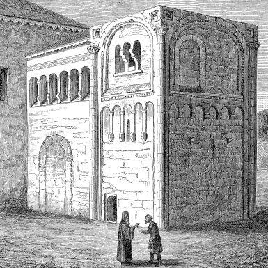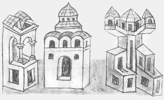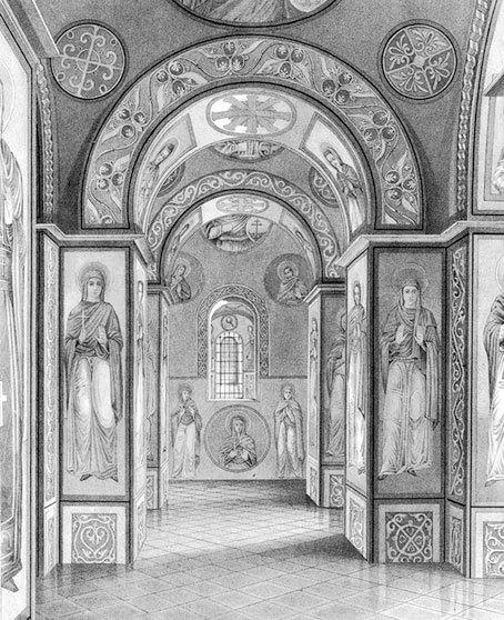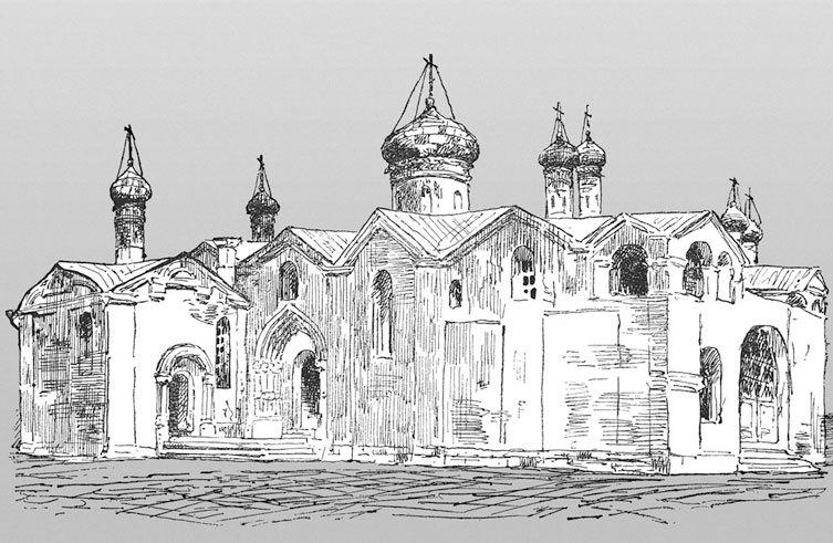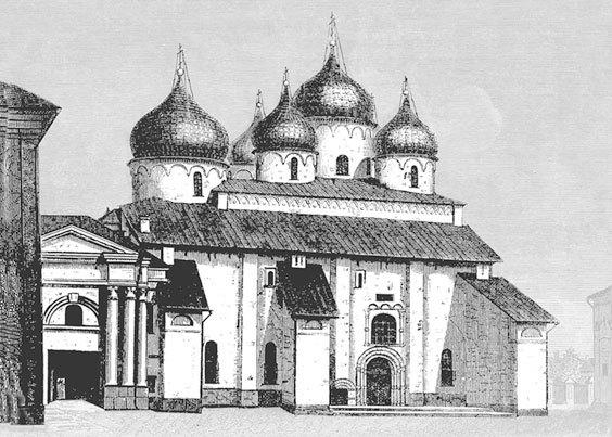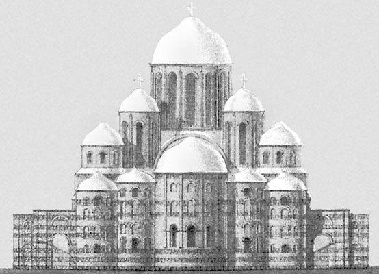 Храм Святой Софии был построен греческими зодчими и украшен греческими художниками. Несмотря на все последующие перестройки и пристройки, храм этот до сих пор может служить образцом византийского зодчества того времени не только на Руси, но и во всей Европе. У нас это единственное здание XI века, сохранившееся сравнительно в большей целости. В первоначальном своем виде это было продолговатое каменное здание, сложенное из огромных кирпичных плит и отчасти дикого камня. Длина его составляла пятьдесят два аршина, ширина – около семидесяти шести аршин, высота – от шестидесяти до семидесяти аршин. На северной, западной и южной сторонах сооружены были каменные хоры, поддерживаемые толстыми столбами с тремя арками внизу и вверху на южной и северной сторонах; алтарь троечастный, полукруглый, с окнами, а рядом с ним – два придела. Здание освещалось пятью куполами, из которых самый большой приходился над серединой церкви, а четыре – над хорами. Алтарные стены, алтарные столбы и главный купол украшали мозаики, а прочие стены – фресковая живопись[7]. Снаружи церковь была обведена папертью, из которой на двух сторонах, южной и северной, шли две витые лестницы на хоры. Эти лестницы расписали изображениями разных случаев из светской жизни: княжеской охоты, княжеского суда, народных увеселений и т. п. (фрески эти существуют и до сих пор, хотя несколько подправленные).