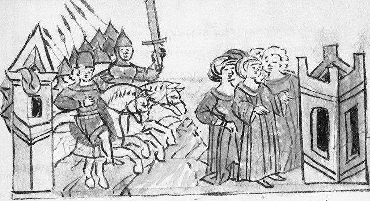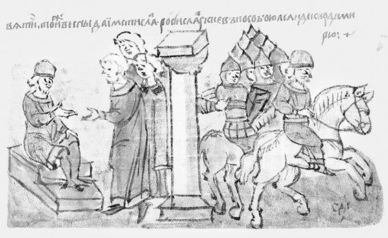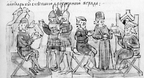 Выдача Владимиром Всеволодичем Мономахом (Переяславским) своего сына Святослава в заложники половецкому князю Кытану; пребывание половецкой дружины во главе с Итларем в Переяславле. Миниатюра из Радзивилловской летописи