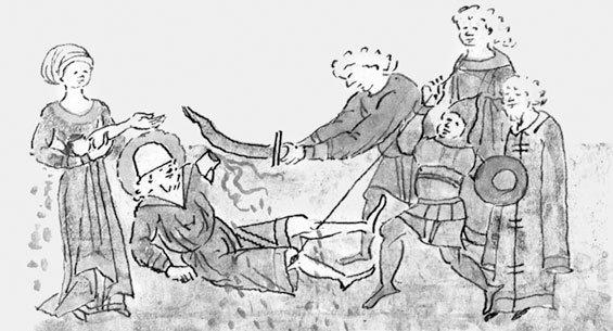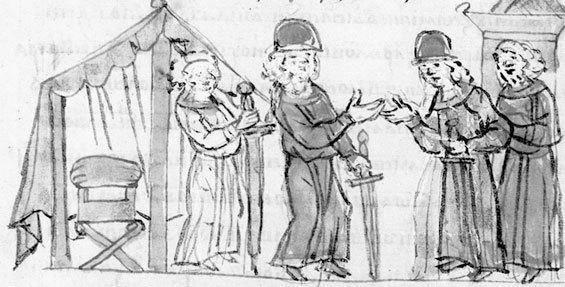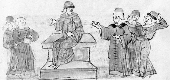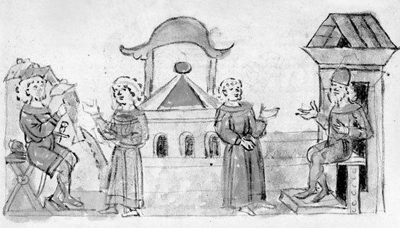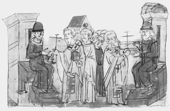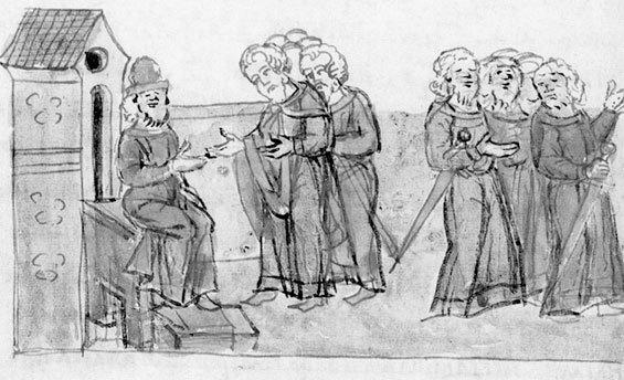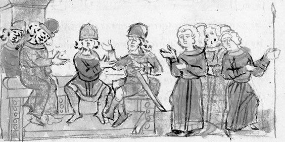 Объяснение причин ослепления Василька Ростиславича Теребоелъского Владимиру Всеволодичу Мономаху (Переяславскому) послами Святополка Изяславича Киевского; уход послов Святополка от Владимира. Миниатюра из Радзивилловской летописи
