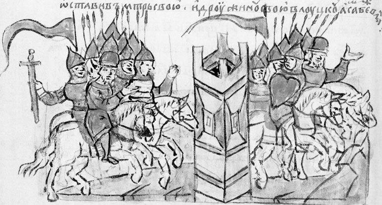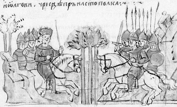 Уход Владимира Всеволодича Мономаха из Чернигова в Переяславль на отцовский стол; приближение к Чернигову Олега Святославича Тмутараканского. Миниатюра из Радзивилловской летописи