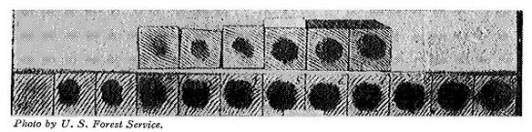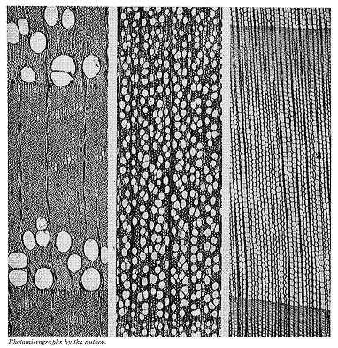Photomicrograph of a small block of western hemlock. At the top is the cross section showing to the right the late wood of one season's growth, to the left the early wood of the next season. The other two sections are longitudinal and show the fibrous character of the wood. To the left is the radial section with three rays crossing it. To the right is the tangential section upon which the rays appear as vertical rows of beads. × 35. Photo by the author.