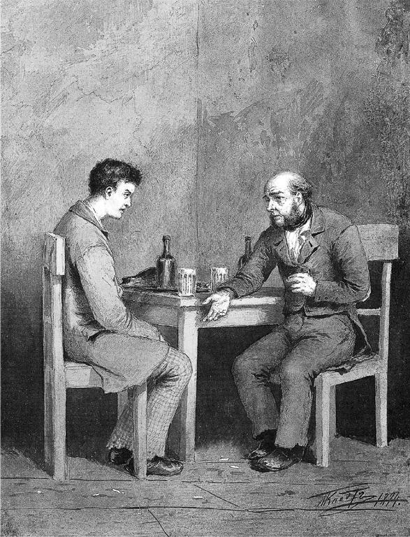 — А осмелюсь ли, милостивый государь мой, обратиться к вам с разговором приличным? Ибо хотя вы и не в значительном виде, но опытность моя отличает в вас человека образованного и к напитку непривычного. Сам всегда уважал образованность, соединенную с сердечными чувствами, и, кроме того, состою титулярным советником. Мармеладов — такая фамилия; титулярный советник. Осмелюсь узнать, служить изволили?