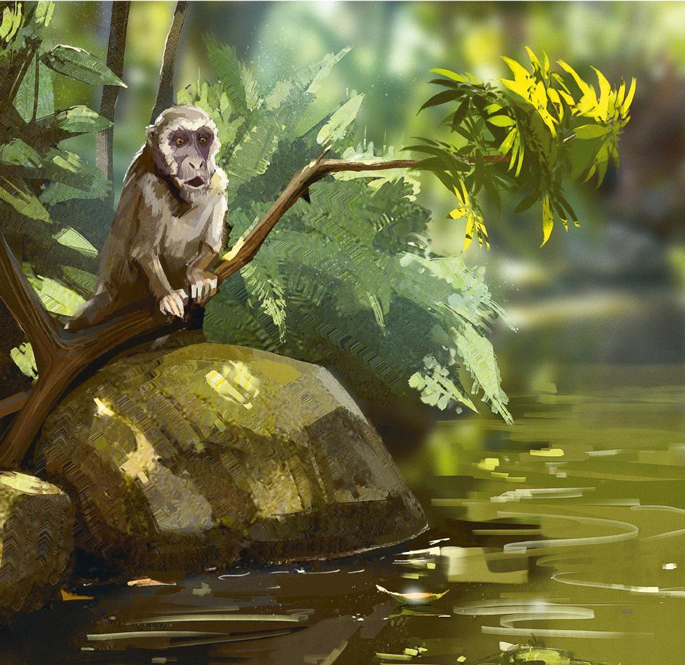 Густая зелень низко нависла над водой. Тёмное зеркало незаметно переходило в черноту прибрежных кустов. На застывшую гладь упал лист и плавно закружился в центре разбегающихся колечек. Зорко озираясь, мягко переступая цепкими лапами, по огромному наклонному стволу спускалась обезьяна. Острые глазки быстро посматривали по сторонам, вытянутый нос двигался, щупая насыщенный тропическими ароматами воздух, пушистый хвост поднялся и завис в ожидании рывка.