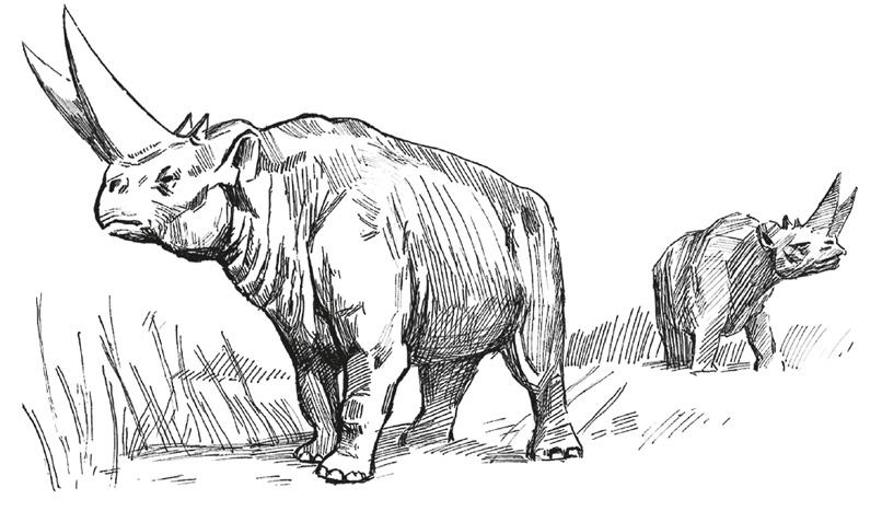 Arsinoitherium zitelli с двумя огромными и двумя маленькими рогами над глазами