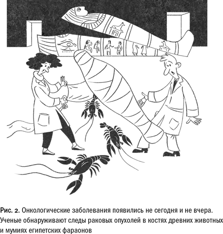 Историческая хроника рака на одном из лучших англоязычных ресурсов, посвященных этому заболеванию, открывается сообщением: “70–80 млн лет назад — раковые клетки в костях динозавра”. Собственно, одной этой фразы достаточно для того, чтобы начать и закончить дискуссию на тему “А вот раньше-то никакого рака не было”. Как мы видим, даже динозавры — и те не убереглись. Что же касается наших человекообразных предков, то их старейшие окаменелости со следами раковых повреждений датируются 4,2–3,9 млн лет до н.э. и принадлежат человеку прямоходящему (Homo erectus).