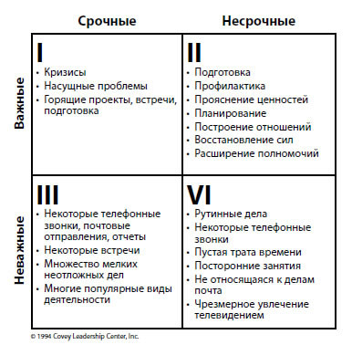 «Важную задачу редко бывает нужно решать сегодня же или даже на текущей неделе... Срочные же задачи взывают к незамедлительным действиям... Их зову невозможно сопротивляться, они кажутся такими важными, и они поглощают всю нашу энергию. Но со временем их обманчивая значимость тает, и тогда, чувствуя себя обманутыми, мы вспоминаем о той действительно важной задаче, которую отодвинули в сторону. Мы начинаем понимать, что стали рабами срочности2.
