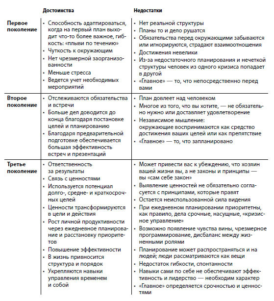 Достоинства и недостатки трех поколений управления временем представлены в таблице.