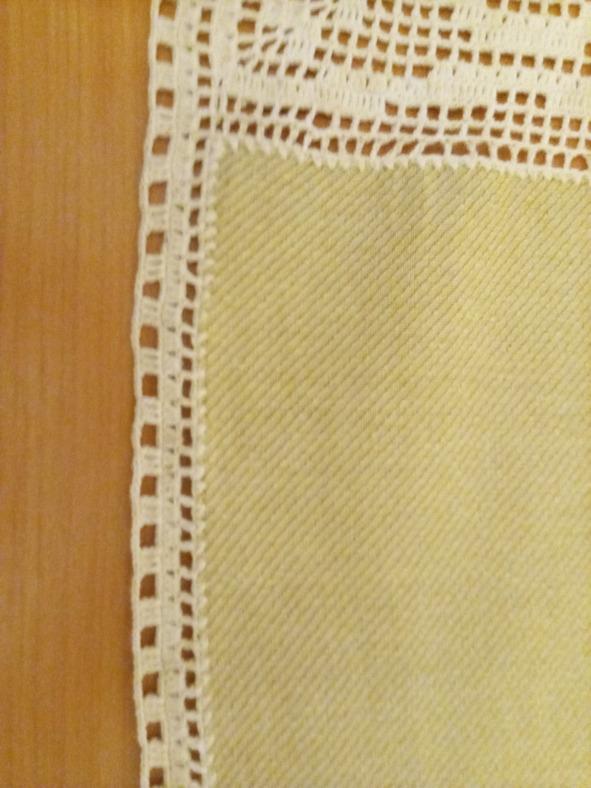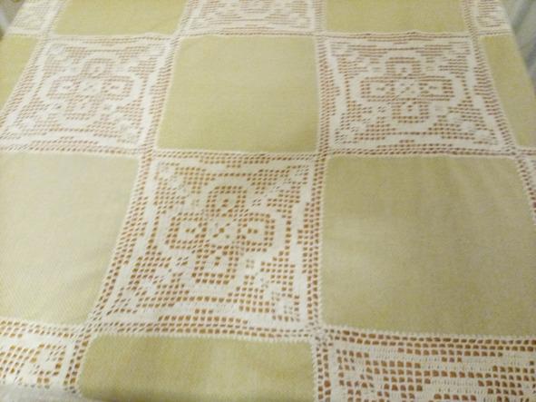 Скатерть может быть разной, цельновязанной, состоящей из квадратов, а может сочетать в себе тканевые и вязаные мотивы. Мне неоднократно встречались скаетрти для обеденных столов из тканевого полотна с вязаной каймой. Для кухни удобно и красиво.